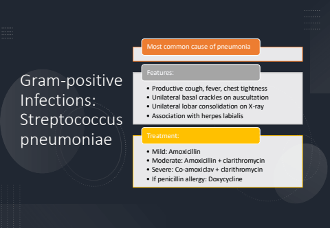 Gram-positive Infections: Streptococcus pneumoniaeMost common cause of pneumonia%u2022 Productive cough, fever, chest tightness%u2022 Unilateral basal crackles on auscultation%u2022 Unilateral lobar consolidation on X-ray%u2022 Association with herpes labialisFeatures:%u2022 Mild: Amoxicillin%u2022 Moderate: Amoxicillin + clarithromycin%u2022 Severe: Co-amoxiclav + clarithromycin%u2022 If penicillin allergy: DoxycyclineTreatment: