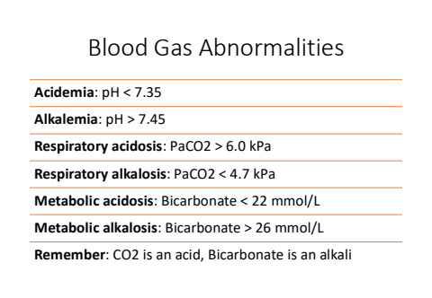 Blood Gas AbnormalitiesAcidemia: pH < 7.35Alkalemia: pH > 7.45Respiratory acidosis: PaCO2 > 6.0 kPaRespiratory alkalosis: PaCO2 < 4.7 kPaMetabolic acidosis: Bicarbonate < 22 mmol/LMetabolic alkalosis: Bicarbonate > 26 mmol/LRemember: CO2 is an acid, Bicarbonate is an alkali