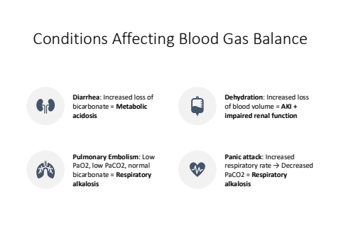Conditions Affecting Blood Gas BalanceDiarrhea: Increased loss of bicarbonate = Metabolic acidosisDehydration: Increased loss of blood volume = AKI + impaired renal functionPulmonary Embolism: Low PaO2, low PaCO2, normal bicarbonate = Respiratory alkalosisPanic attack: Increased respiratory rate %u2192 Decreased PaCO2 = Respiratory alkalosis