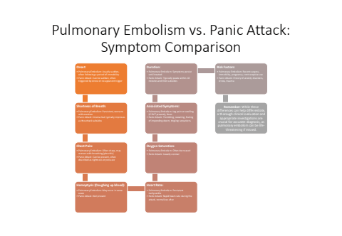 Pulmonary Embolism vs. Panic Attack: Symptom ComparisonOnset:%u2022 Pulmonary Embolism: Usually sudden, often following a period of immobility%u2022 Panic Attack: Can be sudden, often triggered by stress or no apparent triggerShortness of Breath:%u2022 Pulmonary Embolism: Persistent, worsens with exertion%u2022 Panic Attack: Intense but typically improves as the attack subsidesChest Pain:%u2022 Pulmonary Embolism: Often sharp, may worsen with breathing (pleuritic)%u2022 Panic Attack: Can be present, often described as tightness or pressureHemoptysis (Coughing up blood):%u2022 Pulmonary Embolism: May occur in some cases%u2022 Panic Attack: Not presentHeart Rate:%u2022 Pulmonary Embolism: Persistent tachycardia%u2022 Panic Attack: Rapid heart rate during the attack, normalizes afterOxygen Saturation:%u2022 Pulmonary Embolism: Often decreased%u2022 Panic Attack: Usually normalAssociated Symptoms:%u2022 Pulmonary Embolism: Leg pain or swelling (if DVT present), fever%u2022 Panic Attack: Trembling, sweating, feeling of impending doom, tingling sensationsDuration:%u2022 Pulmonary Embolism: Symptoms persist until treated%u2022 Panic Attack: Typically peaks within 10 minutes and then subsidesRisk Factors:%u2022 Pulmonary Embolism: Recent surgery, immobility, pregnancy, contraceptive use%u2022 Panic Attack: History of anxiety disorders, stress, traumaRemember: While these differences can help differentiate, a thorough clinical evaluation and appropriate investigations are crucial for accurate diagnosis, as pulmonary embolism can be lifethreatening if missed.
