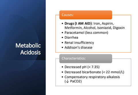 Metabolic Acidosis%u2022 Drugs (I AM AID): Iron, Aspirin, Metformin, Alcohol, Isoniazid, Digoxin%u2022 Paracetamol (less common)%u2022 Diarrhea%u2022 Renal insufficiency%u2022 Addison's diseaseCauses:%u2022 Decreased pH (< 7.35)%u2022 Decreased bicarbonate (< 22 mmol/L)%u2022 Compensatory respiratory alkalosis (%u2193 PaCO2)Characteristics: