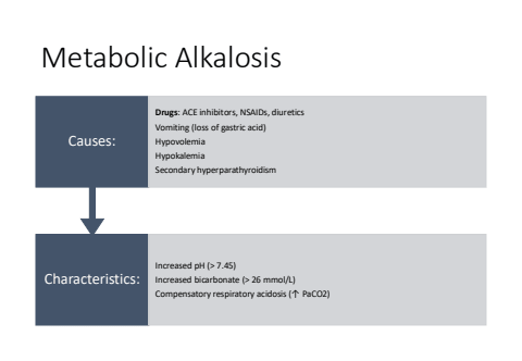 Metabolic AlkalosisCharacteristics:Increased pH (> 7.45)Increased bicarbonate (> 26 mmol/L)Compensatory respiratory acidosis (%u2191 PaCO2)Causes:Drugs: ACE inhibitors, NSAIDs, diureticsVomiting (loss of gastric acid)HypovolemiaHypokalemiaSecondary hyperparathyroidism