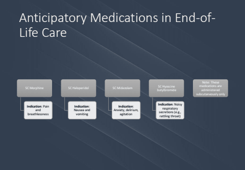 Anticipatory Medications in End-ofLife CareSC MorphineIndication: Pain and breathlessnessSC HaloperidolIndication: Nausea and vomitingSC MidazolamIndication: Anxiety, delirium, agitationSC Hyoscine butylbromideIndication: Noisy respiratory secretions (e.g., rattling throat)Note: These medications are administered subcutaneously only