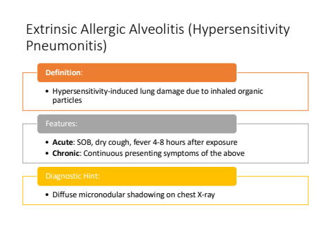 Extrinsic Allergic Alveolitis (Hypersensitivity Pneumonitis)%u2022 Hypersensitivity-induced lung damage due to inhaled organic particlesDefinition:%u2022 Acute: SOB, dry cough, fever 4-8 hours after exposure%u2022 Chronic: Continuous presenting symptoms of the aboveFeatures:%u2022 Diffuse micronodular shadowing on chest X-rayDiagnostic Hint: