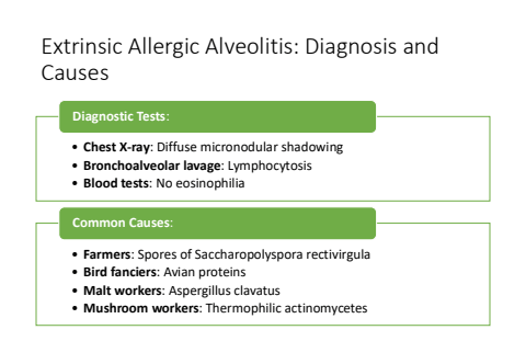 Extrinsic Allergic Alveolitis: Diagnosis and Causes%u2022 Chest X-ray: Diffuse micronodular shadowing%u2022 Bronchoalveolar lavage: Lymphocytosis%u2022 Blood tests: No eosinophiliaDiagnostic Tests:%u2022 Farmers: Spores of Saccharopolyspora rectivirgula%u2022 Bird fanciers: Avian proteins%u2022 Malt workers: Aspergillus clavatus%u2022 Mushroom workers: Thermophilic actinomycetesCommon Causes: