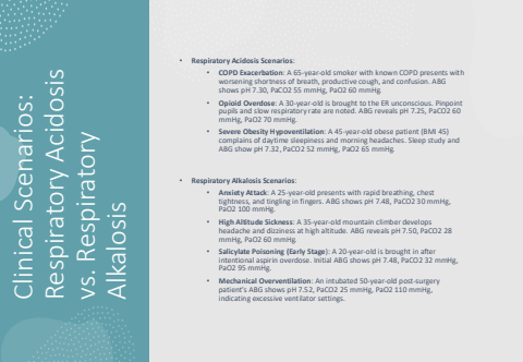 Clinical Scenarios: Respiratory Acidosis vs. Respiratory Alkalosis%u2022 Respiratory Acidosis Scenarios:%u2022 COPD Exacerbation: A 65-year-old smoker with known COPD presents with worsening shortness of breath, productive cough, and confusion. ABG shows pH 7.30, PaCO2 55 mmHg, PaO2 60 mmHg.%u2022 Opioid Overdose: A 30-year-old is brought to the ER unconscious. Pinpoint pupils and slow respiratory rate are noted. ABG reveals pH 7.25, PaCO2 60 mmHg, PaO2 70 mmHg.%u2022 Severe Obesity Hypoventilation: A 45-year-old obese patient (BMI 45) complains of daytime sleepiness and morning headaches. Sleep study and ABG show pH 7.32, PaCO2 52 mmHg, PaO2 65 mmHg.%u2022 Respiratory Alkalosis Scenarios:%u2022 Anxiety Attack: A 25-year-old presents with rapid breathing, chest tightness, and tingling in fingers. ABG shows pH 7.48, PaCO2 30 mmHg, PaO2 100 mmHg.%u2022 High Altitude Sickness: A 35-year-old mountain climber develops headache and dizziness at high altitude. ABG reveals pH 7.50, PaCO2 28 mmHg, PaO2 60 mmHg.%u2022 Salicylate Poisoning (Early Stage): A 20-year-old is brought in after intentional aspirin overdose. Initial ABG shows pH 7.48, PaCO2 32 mmHg, PaO2 95 mmHg.%u2022 Mechanical Overventilation: An intubated 50-year-old post-surgery patient's ABG shows pH 7.52, PaCO2 25 mmHg, PaO2 110 mmHg, indicating excessive ventilator settings.