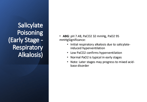Salicylate Poisoning (Early Stage - Respiratory Alkalosis)%u2022 ABG: pH 7.48, PaCO2 32 mmHg, PaO2 95 mmHgSignificance:%u2022 Initial respiratory alkalosis due to salicylateinduced hyperventilation%u2022 Low PaCO2 confirms hyperventilation%u2022 Normal PaO2 is typical in early stages%u2022 Note: Later stages may progress to mixed acidbase disorder