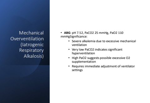 Mechanical Overventilation (Iatrogenic Respiratory Alkalosis)%u2022 ABG: pH 7.52, PaCO2 25 mmHg, PaO2 110 mmHgSignificance:%u2022 Severe alkalemia due to excessive mechanical ventilation%u2022 Very low PaCO2 indicates significant hyperventilation%u2022 High PaO2 suggests possible excessive O2 supplementation%u2022 Requires immediate adjustment of ventilator settings