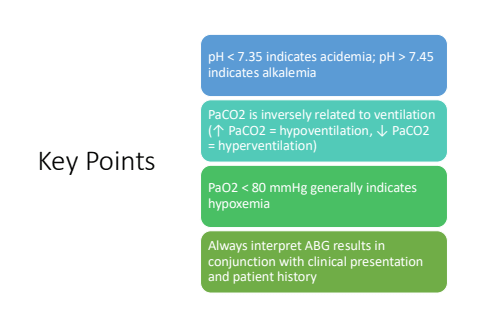 Key PointspH < 7.35 indicates acidemia; pH > 7.45 indicates alkalemiaPaCO2 is inversely related to ventilation (%u2191 PaCO2 = hypoventilation, %u2193 PaCO2 = hyperventilation)PaO2 < 80 mmHg generally indicates hypoxemiaAlways interpret ABG results in conjunction with clinical presentation and patient history