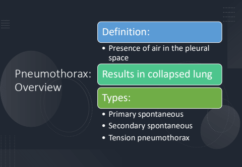 Pneumothorax: OverviewDefinition:%u2022 Presence of air in the pleural spaceResults in collapsed lungTypes:%u2022 Primary spontaneous%u2022 Secondary spontaneous%u2022 Tension pneumothorax