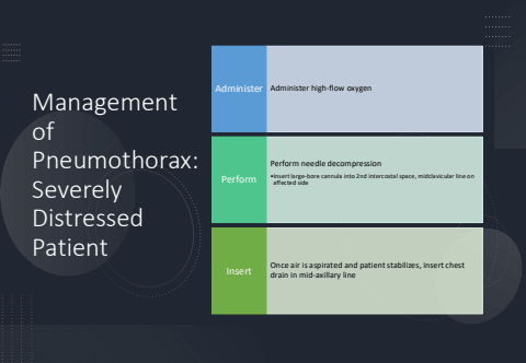 Management of Pneumothorax: Severely Distressed PatientAdminister Administer high-flow oxygenPerform needle decompression%u2022Insert large-bore cannula into 2nd intercostal space, midclavicular line on Perform affected sideOnce air is aspirated and patient stabilizes, insert chest drain in mid-axillary line Insert