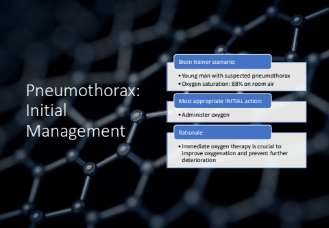 Pneumothorax: Initial Management%u2022Young man with suspected pneumothorax%u2022Oxygen saturation: 88% on room airBrain trainer scenario:%u2022Administer oxygenMost appropriate INITIAL action:%u2022Immediate oxygen therapy is crucial to improve oxygenation and prevent further deteriorationRationale: