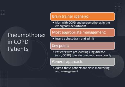 Pneumothorax in COPD PatientsBrain trainer scenario:%u2022 Man with COPD and pneumothorax in the emergency departmentMost appropriate management:%u2022 Insert a chest drain and admitKey point:%u2022 Patients with pre-existing lung disease (e.g., COPD) tolerate pneumothorax poorlyGeneral approach:%u2022 Admit these patients for close monitoring and management