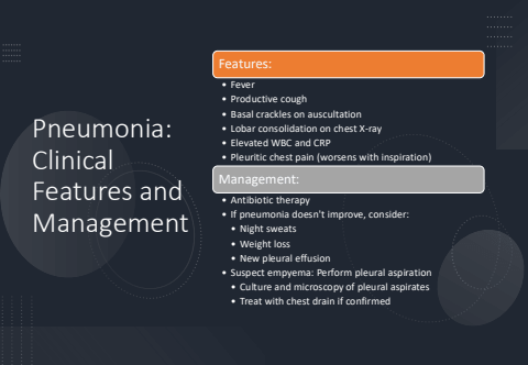 Pneumonia: Clinical Features and ManagementFeatures:%u2022 Fever%u2022 Productive cough%u2022 Basal crackles on auscultation%u2022 Lobar consolidation on chest X-ray%u2022 Elevated WBC and CRP%u2022 Pleuritic chest pain (worsens with inspiration)Management:%u2022 Antibiotic therapy%u2022 If pneumonia doesn't improve, consider:%u2022 Night sweats%u2022 Weight loss%u2022 New pleural effusion%u2022 Suspect empyema: Perform pleural aspiration%u2022 Culture and microscopy of pleural aspirates%u2022 Treat with chest drain if confirmed