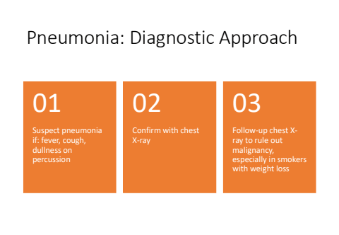 Pneumonia: Diagnostic ApproachSuspect pneumonia if: fever, cough, dullness on percussion01Confirm with chest X-ray02Follow-up chest Xray to rule out malignancy, especially in smokers with weight loss03