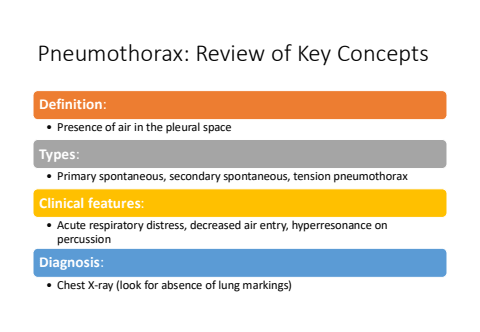 Pneumothorax: Review of Key ConceptsDefinition:%u2022 Presence of air in the pleural spaceTypes:%u2022 Primary spontaneous, secondary spontaneous, tension pneumothoraxClinical features:%u2022 Acute respiratory distress, decreased air entry, hyperresonance on percussionDiagnosis:%u2022 Chest X-ray (look for absence of lung markings)
