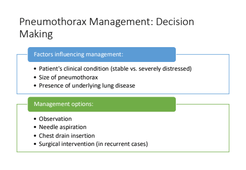 Pneumothorax Management: Decision Making%u2022 Patient's clinical condition (stable vs. severely distressed)%u2022 Size of pneumothorax%u2022 Presence of underlying lung diseaseFactors influencing management:%u2022 Observation%u2022 Needle aspiration%u2022 Chest drain insertion%u2022 Surgical intervention (in recurrent cases)Management options: