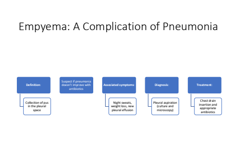 Empyema: A Complication of PneumoniaDefinition:Collection of pus in the pleural spaceSuspect if pneumonia doesn't improve with antibioticsAssociated symptoms:Night sweats, weight loss, new pleural effusionDiagnosis:Pleural aspiration (culture and microscopy)Treatment:Chest drain insertion and appropriate antibiotics