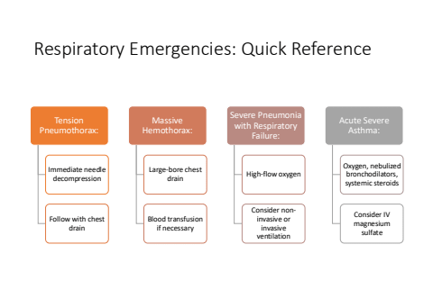Respiratory Emergencies: Quick ReferenceTension Pneumothorax:Immediate needle decompressionFollow with chest drainMassive Hemothorax:Large-bore chest drainBlood transfusion if necessarySevere Pneumonia with Respiratory Failure:High-flow oxygenConsider noninvasive or invasive ventilationAcute Severe Asthma:Oxygen, nebulized bronchodilators, systemic steroidsConsider IV magnesium sulfate