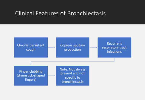 Clinical Features of BronchiectasisChronic persistent coughCopious sputum productionRecurrent respiratory tract infectionsFinger clubbing (drumstick-shaped fingers)Note: Not always present and not specific to bronchiectasis
