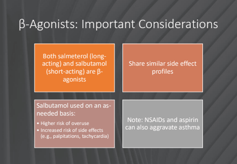 %u03b2-Agonists: Important ConsiderationsBoth salmeterol (longacting) and salbutamol (short-acting) are %u03b2agonistsShare similar side effect profilesSalbutamol used on an asneeded basis:%u2022 Higher risk of overuse%u2022 Increased risk of side effects (e.g., palpitations, tachycardia)Note: NSAIDs and aspirin can also aggravate asthma