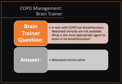 COPD Management: Brain Trainer%u2022 A man with COPD has breathlessness. Nebulized steroids are not available. What is the most appropriate agent to assist in his breathlessness?Brain Trainer Question:Answer: %u2022 Nebulized normal saline