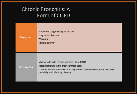 Chronic Bronchitis: A Form of COPDProductive cough lasting %u2265 3 monthsProgressive dyspneaWheezingLow-grade feverFeatures:Most people with chronic bronchitis have COPDTobacco smoking is the most common causeConsider asthma in smokers with nighttime or early morning breathlessness, especially with a history of atopyKey points: