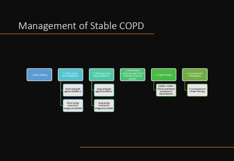 Management of Stable COPD1. Stop smoking 2. Short-acting bronchodilators:Short-acting %u03b22 agonist (SABA) orShort-acting muscarinic antagonist (SAMA)3. Add long-acting bronchodilators:Long-acting %u03b22 agonist (LABA) orLong-acting muscarinic antagonist (LAMA)4. Add inhaled corticosteroids (ICS) if asthmatic features present5. Triple therapy:(LAMA + LABA + ICS) for persistent symptoms or exacerbations6. Consider oral theophyllineif no response to inhaler therapy