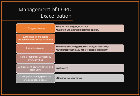 Management of COPD Exacerbation%u2022Use 24-28% oxygen, NOT 100%%u2022Maintain O2 saturation between 88-92% 1. Oxygen therapy:2. Increase short-acting bronchodilators or use nebulizer%u2022 Prednisolone 30 mg stat, then 30 mg OD for 5 days%u2022Or hydrocortisone 100 mg IV if unable to swallow 3. Corticosteroids:4. If no response: Consider IV aminophylline%u2022Antibiotics 5. If purulent sputum, fever, and high CRP:%u2022Non-invasive ventilation 6. For persistent dyspnea and impaired blood gases: