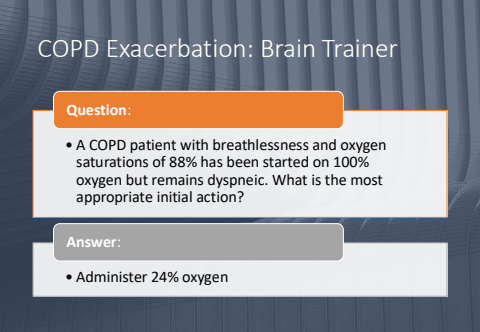 COPD Exacerbation: Brain Trainer%u2022 A COPD patient with breathlessness and oxygen saturations of 88% has been started on 100% oxygen but remains dyspneic. What is the most appropriate initial action?Question:%u2022 Administer 24% oxygenAnswer:
