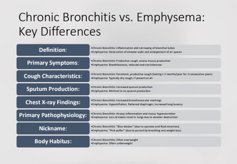 Chronic Bronchitis vs. Emphysema: Key Differences%u2022Chronic Bronchitis: Inflammation and narrowing of bronchial tubes Definition %u2022Emphysema: Destruction of alveolar walls and enlargement of air spaces :%u2022Chronic Bronchitis: Productive cough, excess mucus production Primary Symptoms %u2022Emphysema: Breathlessness, reduced exercise tolerance :%u2022Chronic Bronchitis: Persistent, productive cough (lasting %u2265 3 months/year for 2 consecutive years) Cough Characteristics %u2022Emphysema: Typically dry cough, if present at all :%u2022Chronic Bronchitis: Increased sputum production Sputum Production: %u2022Emphysema: Minimal to no sputum production%u2022Chronic Bronchitis: Increased bronchovascular markings Chest X %u2022Emphysema: Hyperinflation, flattened diaphragm, increased lung lucency -ray Findings:%u2022Chronic Bronchitis: Airway inflammation and mucus hypersecretion Primary Pathophysiology: %u2022Emphysema: Loss of elastic recoil in lungs due to alveolar destruction%u2022Chronic Bronchitis: \Nickname %u2022Emphysema: \:%u2022Chronic Bronchitis: Often overweight Body Habitus: %u2022Emphysema: Often underweight
