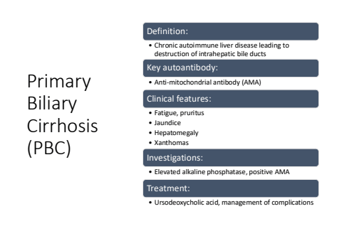 Primary Biliary Cirrhosis (PBC)Definition:%u2022 Chronic autoimmune liver disease leading to destruction of intrahepatic bile ductsKey autoantibody:%u2022 Anti-mitochondrial antibody (AMA)Clinical features:%u2022 Fatigue, pruritus%u2022 Jaundice%u2022 Hepatomegaly%u2022 XanthomasInvestigations:%u2022 Elevated alkaline phosphatase, positive AMATreatment:%u2022 Ursodeoxycholic acid, management of complications