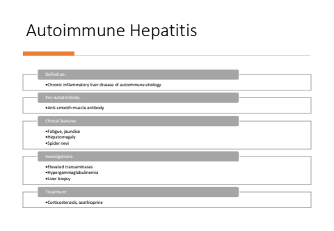 Autoimmune Hepatitis%u2022Chronic inflammatory liver disease of autoimmune etiologyDefinition:%u2022Anti-smooth muscle antibodyKey autoantibody:%u2022Fatigue, jaundice%u2022Hepatomegaly%u2022Spider neviClinical features:%u2022Elevated transaminases%u2022Hypergammaglobulinemia%u2022Liver biopsyInvestigations:%u2022Corticosteroids, azathioprineTreatment:
