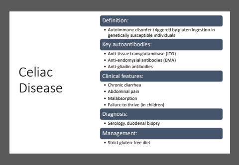 Celiac DiseaseDefinition:%u2022 Autoimmune disorder triggered by gluten ingestion in genetically susceptible individualsKey autoantibodies:%u2022 Anti-tissue transglutaminase (tTG)%u2022 Anti-endomysial antibodies (EMA)%u2022 Anti-gliadin antibodiesClinical features:%u2022 Chronic diarrhea%u2022 Abdominal pain%u2022 Malabsorption%u2022 Failure to thrive (in children)Diagnosis:%u2022 Serology, duodenal biopsyManagement:%u2022 Strict gluten-free diet