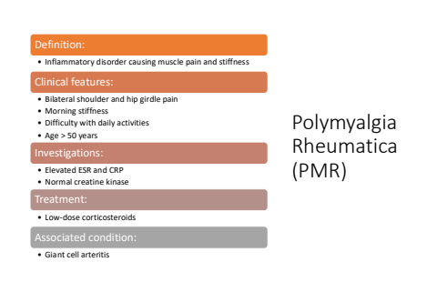 Polymyalgia Rheumatica (PMR)Definition:%u2022 Inflammatory disorder causing muscle pain and stiffnessClinical features:%u2022 Bilateral shoulder and hip girdle pain%u2022 Morning stiffness%u2022 Difficulty with daily activities%u2022 Age > 50 yearsInvestigations:%u2022 Elevated ESR and CRP%u2022 Normal creatine kinaseTreatment:%u2022 Low-dose corticosteroidsAssociated condition:%u2022 Giant cell arteritis