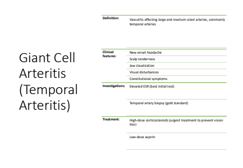 Giant Cell Arteritis (Temporal Arteritis)Definition: Vasculitis affecting large and medium-sized arteries, commonly temporal arteriesClinicalfeatures:New-onset headacheScalp tendernessJaw claudicationVisual disturbancesConstitutional symptomsInvestigations: Elevated ESR (best initial test)Temporal artery biopsy (gold standard)Treatment: High-dose corticosteroids (urgent treatment to prevent vision loss)Low-dose aspirin