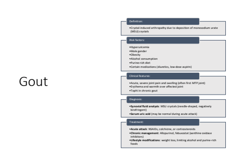 Gout%u2022Crystal-induced arthropathy due to deposition of monosodium urate (MSU) crystalsDefinition:%u2022Hyperuricemia%u2022Male gender%u2022Obesity%u2022Alcohol consumption%u2022Purine-rich diet%u2022Certain medications (diuretics, low-dose aspirin)Risk factors:%u2022Acute, severe joint pain and swelling (often first MTP joint)%u2022Erythema and warmth over affected joint%u2022Tophi in chronic goutClinical features:%u2022Synovial fluid analysis: MSU crystals (needle-shaped, negatively birefringent)%u2022Serum uric acid (may be normal during acute attack)Diagnosis:%u2022Acute attack: NSAIDs, colchicine, or corticosteroids%u2022Chronic management: Allopurinol, febuxostat (xanthine oxidase inhibitors)%u2022Lifestyle modifications: weight loss, limiting alcohol and purine-rich foodsTreatment: