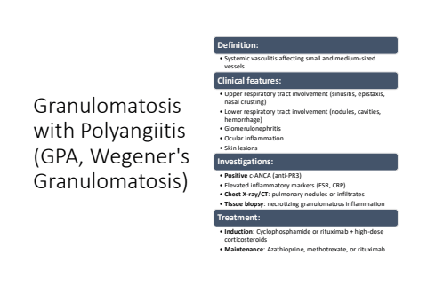 Granulomatosis with Polyangiitis (GPA, Wegener's Granulomatosis)Definition:%u2022 Systemic vasculitis affecting small and medium-sized vesselsClinical features:%u2022 Upper respiratory tract involvement (sinusitis, epistaxis, nasal crusting)%u2022 Lower respiratory tract involvement (nodules, cavities, hemorrhage)%u2022 Glomerulonephritis%u2022 Ocular inflammation%u2022 Skin lesionsInvestigations:%u2022 Positive c-ANCA (anti-PR3)%u2022 Elevated inflammatory markers (ESR, CRP)%u2022 Chest X-ray/CT: pulmonary nodules or infiltrates%u2022 Tissue biopsy: necrotizing granulomatous inflammationTreatment:%u2022 Induction: Cyclophosphamide or rituximab + high-dose corticosteroids%u2022 Maintenance: Azathioprine, methotrexate, or rituximab