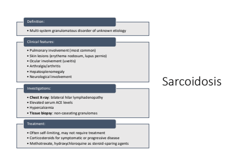 Sarcoidosis%u2022 Multi-system granulomatous disorder of unknown etiologyDefinition:%u2022 Pulmonary involvement (most common)%u2022 Skin lesions (erythema nodosum, lupus pernio)%u2022 Ocular involvement (uveitis)%u2022 Arthralgia/arthritis%u2022 Hepatosplenomegaly%u2022 Neurological involvementClinical features:%u2022 Chest X-ray: bilateral hilar lymphadenopathy%u2022 Elevated serum ACE levels%u2022 Hypercalcemia%u2022 Tissue biopsy: non-caseating granulomasInvestigations:%u2022 Often self-limiting, may not require treatment%u2022 Corticosteroids for symptomatic or progressive disease%u2022 Methotrexate, hydroxychloroquine as steroid-sparing agentsTreatment: