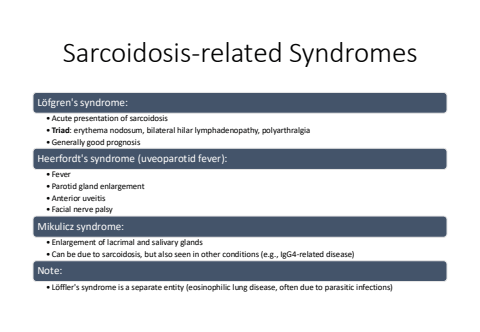 Sarcoidosis-related SyndromesL%u00f6fgren's syndrome:%u2022Acute presentation of sarcoidosis%u2022 Triad: erythema nodosum, bilateral hilar lymphadenopathy, polyarthralgia%u2022Generally good prognosisHeerfordt's syndrome (uveoparotid fever):%u2022 Fever%u2022 Parotid gland enlargement%u2022Anterior uveitis%u2022 Facial nerve palsyMikulicz syndrome:%u2022 Enlargement of lacrimal and salivary glands%u2022 Can be due to sarcoidosis, but also seen in other conditions (e.g., IgG4-related disease)Note:%u2022 L%u00f6ffler's syndrome is a separate entity (eosinophilic lung disease, often due to parasitic infections)