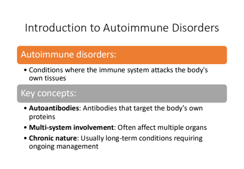 Introduction to Autoimmune DisordersAutoimmune disorders:%u2022 Conditions where the immune system attacks the body's own tissuesKey concepts:%u2022 Autoantibodies: Antibodies that target the body's own proteins%u2022 Multi-system involvement: Often affect multiple organs%u2022 Chronic nature: Usually long-term conditions requiring ongoing management