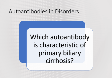 Autoantibodies in DisordersWhich autoantibody is characteristic of primary biliary cirrhosis?