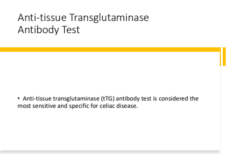 Anti-tissue Transglutaminase Antibody Test%u2022 Anti-tissue transglutaminase (tTG) antibody test is considered the most sensitive and specific for celiac disease.