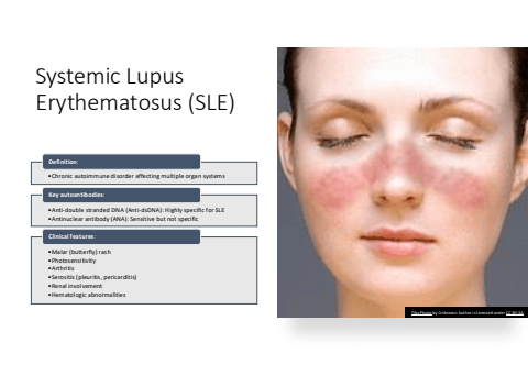 Systemic Lupus Erythematosus (SLE)%u2022Chronic autoimmune disorder affecting multiple organ systemsDefinition:%u2022Anti-double stranded DNA (Anti-dsDNA): Highly specific for SLE%u2022Antinuclear antibody (ANA): Sensitive but not specificKey autoantibodies:%u2022Malar (butterfly) rash%u2022Photosensitivity%u2022Arthritis%u2022Serositis (pleuritis, pericarditis)%u2022Renal involvement%u2022Hematologic abnormalitiesClinical features:This Photo by Unknown Author is licensed under CC BY-SA