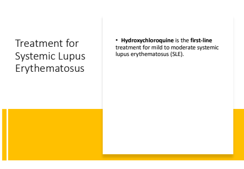 Treatment for Systemic Lupus Erythematosus%u2022 Hydroxychloroquine is the first-linetreatment for mild to moderate systemic lupus erythematosus (SLE).