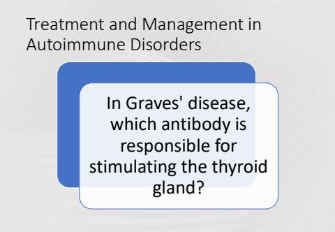 Treatment and Management in Autoimmune DisordersIn Graves' disease, which antibody is responsible for stimulating the thyroid gland?