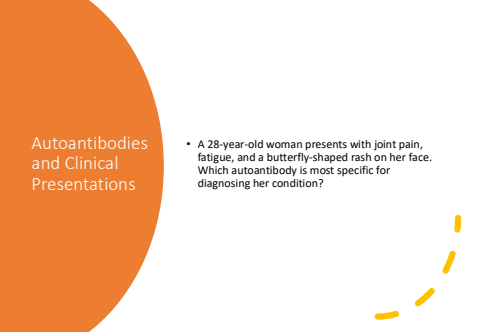 Autoantibodies and Clinical Presentations%u2022 A 28-year-old woman presents with joint pain, fatigue, and a butterfly-shaped rash on her face. Which autoantibody is most specific for diagnosing her condition?