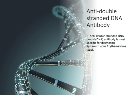 Anti-double stranded DNA Antibody%u2022 Anti-double stranded DNA (anti-dsDNA) antibody is most specific for diagnosing Systemic Lupus Erythematosus (SLE).