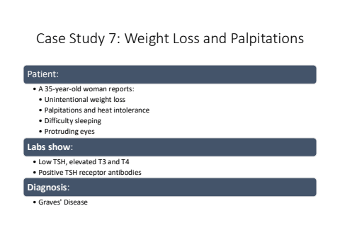 Case Study 7: Weight Loss and PalpitationsPatient:%u2022 A 35-year-old woman reports:%u2022 Unintentional weight loss%u2022 Palpitations and heat intolerance%u2022 Difficulty sleeping%u2022 Protruding eyesLabs sho%u2022 Low TSH, elevated T3 and T4%u2022 Positive TSH receptor antibodiesDiagnosis:%u2022 Graves' Disease