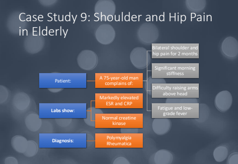 Case Study 9: Shoulder and Hip Pain in ElderlyPatient: A 75-year-old man complains of:Bilateral shoulder and hip pain for 2 monthsSignificant morning stiffnessDifficulty raising arms above headFatigue and lowgrade fever Labs shoMarkedly elevated ESR and CRPNormal creatine kinaseDiagnosis:Polymyalgia Rheumatica